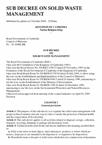 The purpose of this sub-decree is to regulate the solid waste management with proper technical manner and safe way in order to ensure the protection of human health and the conservation of bio-diversity.